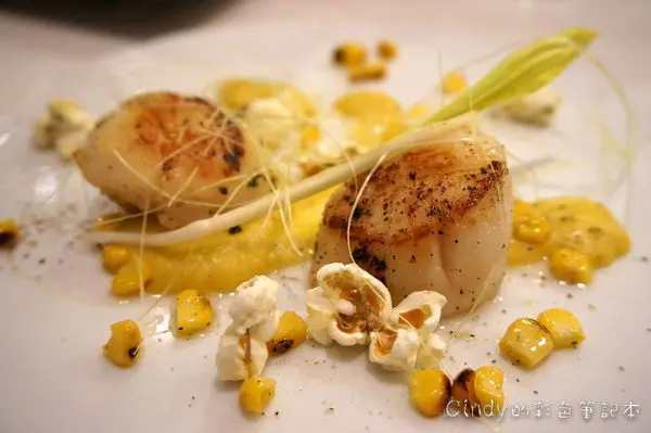煎干貝、玉米油醋醬、迷迭香風味爆米花、玉米鬚、玉米苗 620元