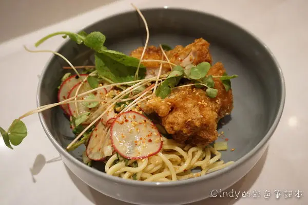 香脆炸雞、手工義式涼麵、芝麻醬、喬麥苗 420元