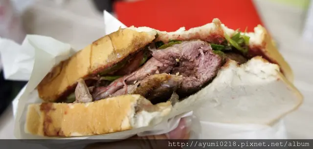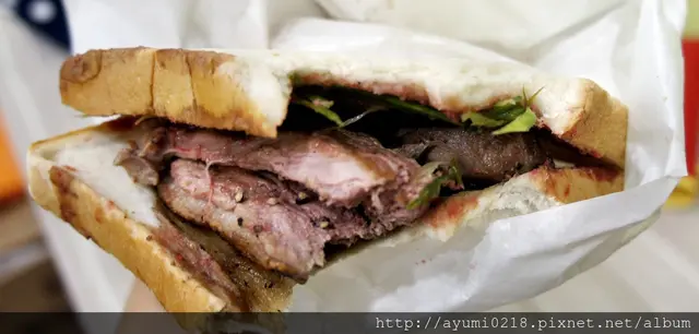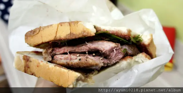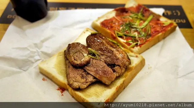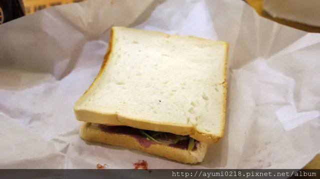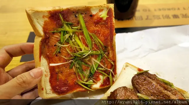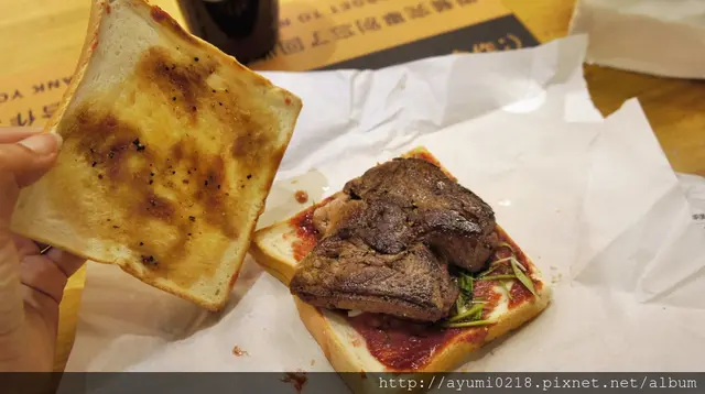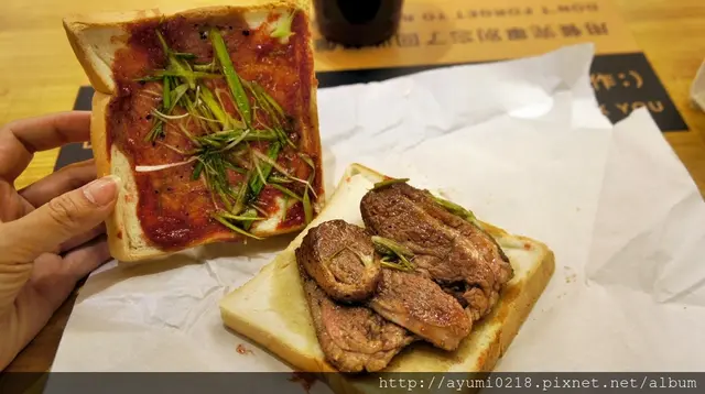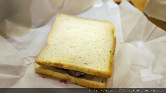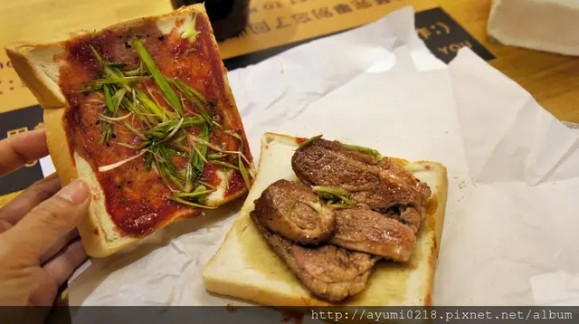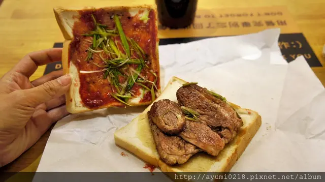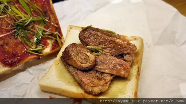 掀開土司~裡頭的豬肉已經醃漬過~很香