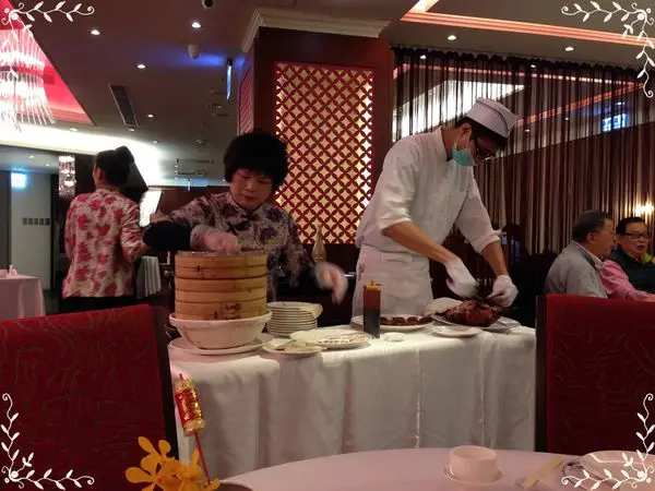 當天晚上生意相當的好,幾乎客滿了,服務生很忙上菜很慢,看到有很多桌都有點烤鴨(一吃$2000),廚師桌邊服務現片現包。