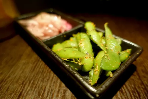 鐵窩招待的小菜:毛豆、紫洋蔥