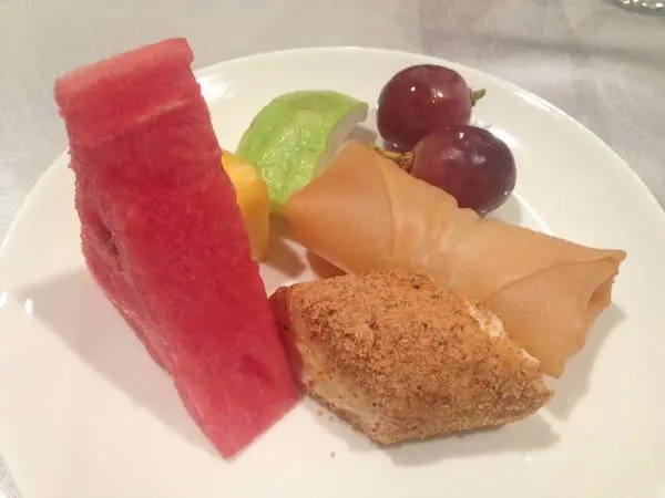 [水果+甜點] 水果和甜點放在一盤 很推裹著花生粉的甜點 類以麻及的口感 還有一些奶皇和奶油饀