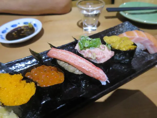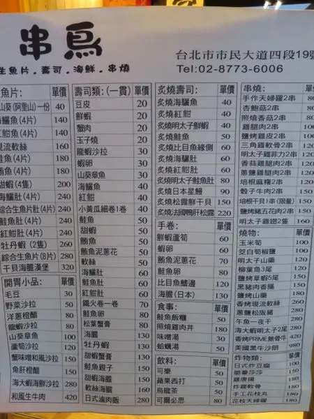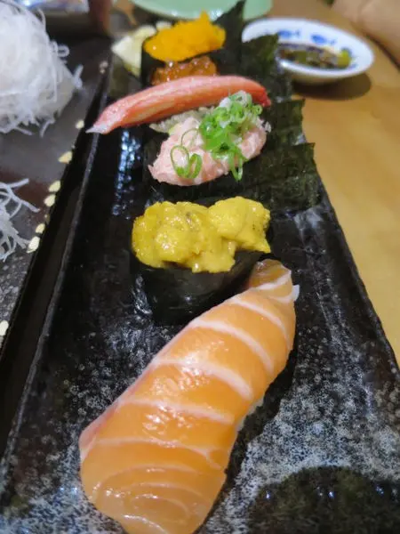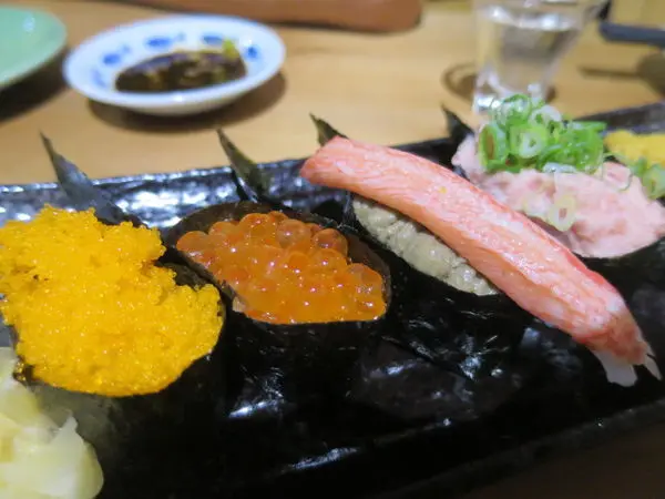[蝦卵(30元)/鮭魚卵(80元)/松葉蟹膏(80元)/鮪魚泥蔥花(50元)/海膽(130元)/鮭魚肚(60元)]