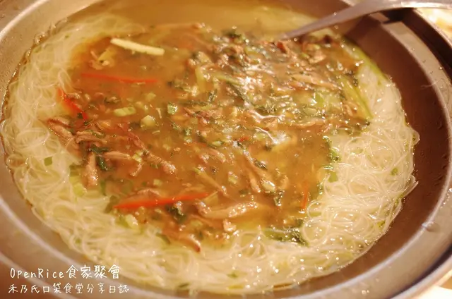 這道則是九華片皮鴨的第三吃【雪菜火鴨米(米粉)】,以大火將鴨骨精華熬出,乳白湯頭香氣馥郁而不死鹹,搭配廣東傳統食材雪菜熬煮,待米粉吸飽湯汁後伴隨些韭菜入口,帶有陣陣清香。三種不同風味的烤鴨料理餐,循序漸進,道道別具特色,自古至今皆為粵東香江酒樓大宴菜式,令人讚不絕口!另外,喜愛充滿熱炒風味的饕客也可選擇鴨鬆炒飯或醬爆鴨骨,充滿鑊氣的鴨骨鹹香夠味,微辣的滋味更是不少人的心頭最愛。
