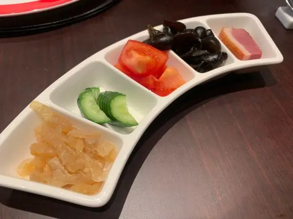 小品分別是拌雲耳 銀絲蜇皮 翡翠羽衣 梅汁西紅杮 煙燻櫻桃鴨胸 放在一個像彎月的小格盤裡