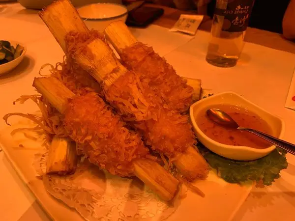 蝦泥裹粉包在甘蔗枝上 配上一點酸甜酸甜的醬 好吃