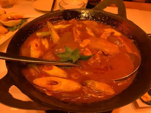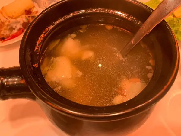 [剥皮辣椒燉嫩雞 380元] 這一份湯大概3-4個人份 有嫩雞燉煮的 高湯還有蛤蜊 配上台灣剝皮辣椒
