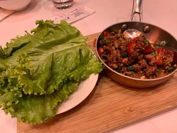 但實際上的爆炒牛絞肉 一點點香辣 包上生菜吃更爽脆