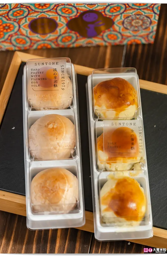 招牌芋泥流心酥與金沙蛋黃酥分別裝在特製長條包裝,三入一條,打開後可以看到手工包的流心酥,每顆都被獨立保護,不怕運送過程中磕碰,這些細節之處讓人倍感用心!