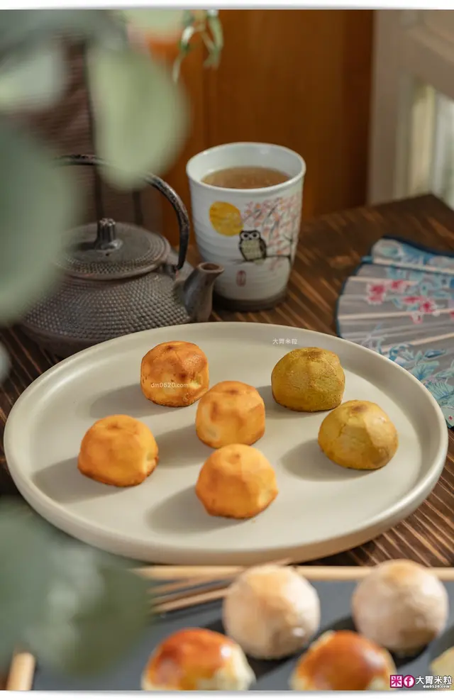 最後則是三統漢菓子「2022中秋餡禮」流心三重奏禮盒的抹茶柚子流心酥x鳳凰流心酥x肉鬆流心酥,一顆顆好像西式小蛋糕與日式和果子饅頭結合,造型非常可愛!