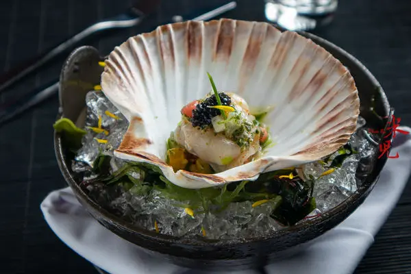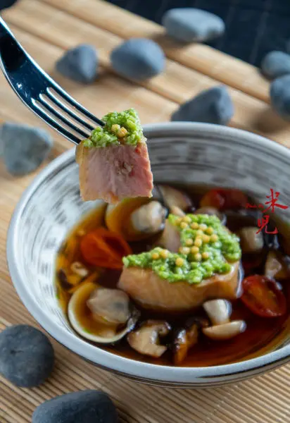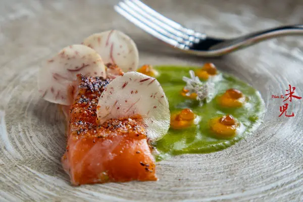 炙燒紐西蘭國王鮭、墨西哥辣椒泥、鮭魚卵。很美的一道菜,炙燒的國王鮭上是七味粉,綠色的是墨西哥辣椒泥,在鮭魚卵下方藏著黃檸檬泥,配上炸芋頭圓片一起吃,很跳躍的風味,但味道很和諧。