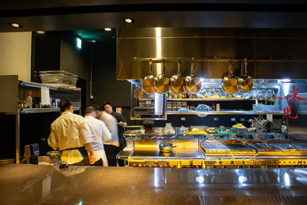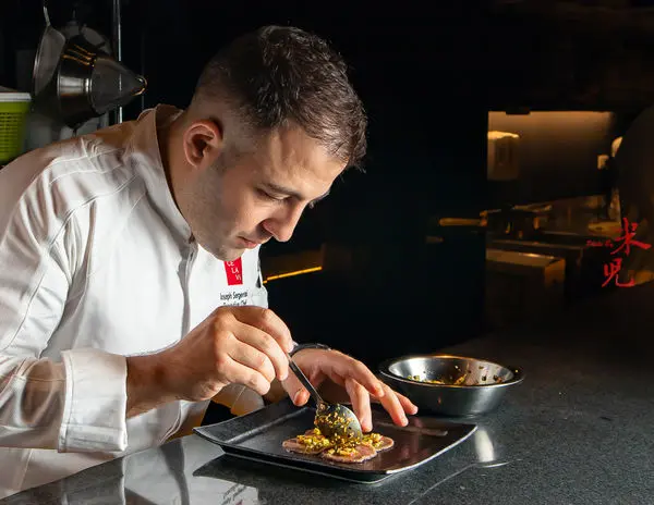 行政主廚Joey Sergentakis很認真地在擺盤,我在開放式廚房外看著他做菜看了很久,他每一道菜都好搞工,許多事先處理好的食材一層一層擺上去,連擺的位置都有講究,但這個主廚很有趣,他很喜歡亞洲的風味,所以感覺他似乎一股腦地想把亞洲調味都用上去,所以每一道菜的味道都很豐富。