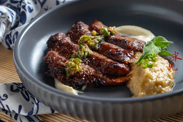 伊比利豬老饕佐BBQ醬汁,奶油燉白菜、烤三星蔥、辣根奶醬。剛上桌還以為是烤牛肉呢!沒想到居然是伊比利豬,原來是用伊比利豬的上蓋肉抹上烤肉醬去烤,所以肉色感覺較深,口味自然也較重。上面是用三星蔥做的蔥醬,其實不搭配辣根奶醬就已經很好吃了。前面那沱奶油燉白菜個人覺得太奶,我反而沒有很喜歡,直接把肉嗑光~~哈哈~~