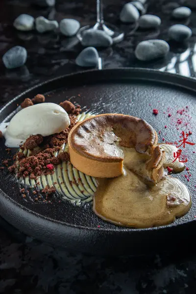 奶茶塔配香草冰淇淋、巧克力酥餅、百香果醬、杏仁餅乾碎。切下去就奶醬橫流的奶茶塔,很有意思,塔皮很酥脆,奶醬流了一盤子也不會讓塔皮吃起來塌塌的,因為加了百香果醬的酸甜,吃完整個也不會膩。