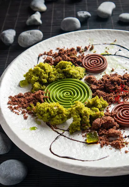 抹茶搭配黑巧克力,64%黑巧克力奶醬、抹茶戚風蛋糕、綠紫蘇凍。這盤甜點賣相極佳,看起來有點日式枯山水的味道啊~(但現場有人說像蚊香,哈哈哈~~),總之,抹茶巧克力和黑巧克力本身就滿滑潤可口的,和粉末狀的巧克力醬及抹茶戚風蛋糕一起吃,又是不同口感,最妙的是畫龍點睛的紫蘇凍。