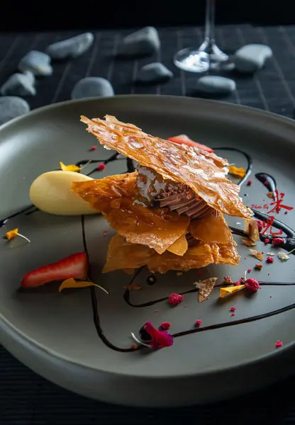 黑巧芝麻帕林千層、64%黑巧克力醬,黑芝麻帕林內,千層派皮。很有意思的千層派呈現方式,但可能太好吃了,所以等我拍完照還來不及回神,它已經被搶食一空,所以我一口都沒吃到啦~~泣~~