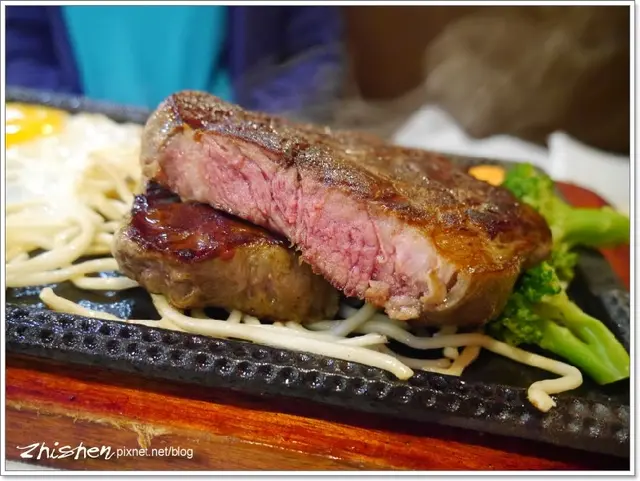 Ω霜降牛排自有其部位的特殊風味,不過有一定程度油脂感,肉也較厚切的細緻不少。