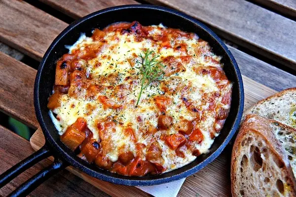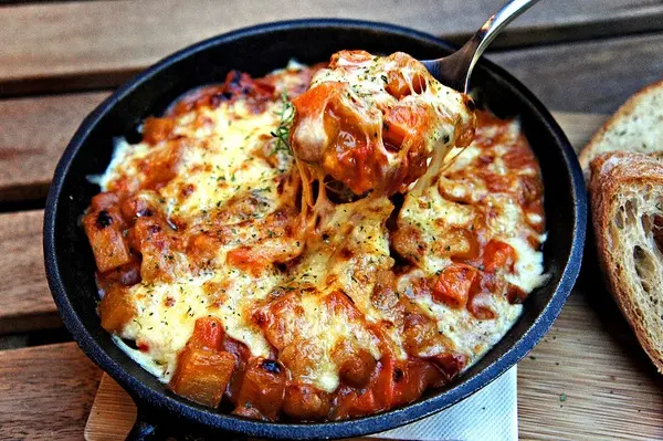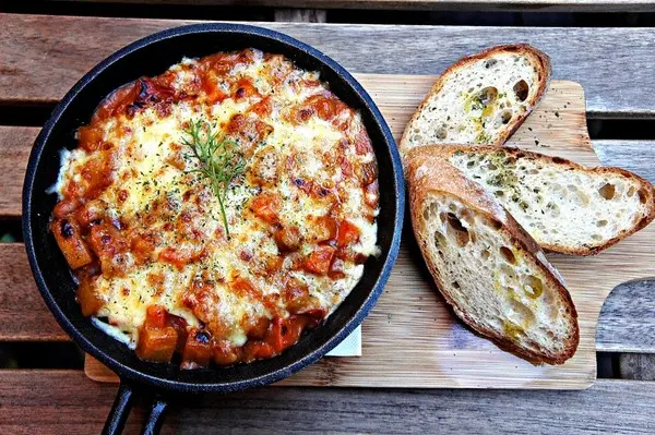 BBQ烤鷹嘴豆 屬於偏北非料理 豆子吃起來沒有衝突的怪味道 裡面有新鮮番茄 整體味道算滿清爽的 焗烤要趁熱 才會有牽絲的感覺