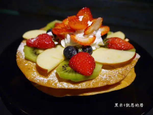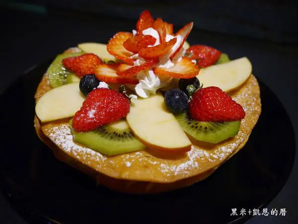 以當令水果擺飾,配色很豐富有草莓、奇異果、蘋果、藍莓