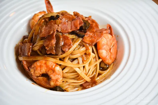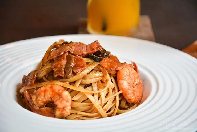 黑橄欖、緹魚、培根、煙燻紅椒、巴薩米可醋、烏斯特醬油、細扁麵