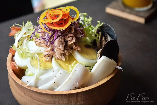 雞蛋、鮪魚、綜合沙拉、清燙海鮮、紅甜椒、黃甜椒、黑橄欖