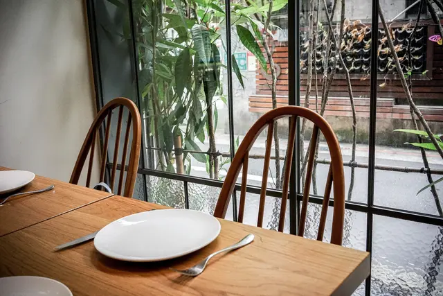 用餐區也讓我很驚艷,不管是沙發區或者大型長桌,暖色系木桌椅與外面植物形成溫暖的配色,兩人座位等等設計都不會有擁擠感與不適感,我喜歡大落地窗邊的位置,非常明亮且又帶點隱私性。