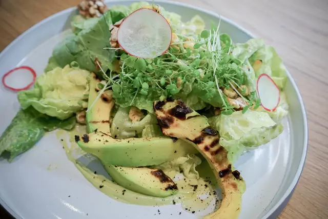 我反而喜歡裡頭的碳烤玉米粒跟萵苣配上店家自製的綠女神沙拉醬,清爽不油膩且帶一點酸甜味道,加上還有蜜核桃增加口感,這一份沙拉份量也不小,是蠻有份量的喔。
