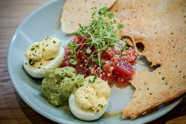 加州風味的醃漬鮪魚塊,因為浸泡道些微檸檬汁所以底部會有點熟度,一旁的惡魔蛋很酷,感覺蛋黃是特別挖出來後在去融合其他味道,吃起來不僅有蛋黃原本香氣更多了不同的柔順感,建議吃法是一片海鹽脆餅,幾塊鮪魚肉,酪梨醬跟一些惡魔蛋,一口咬下,著實清爽又入味且無負擔。