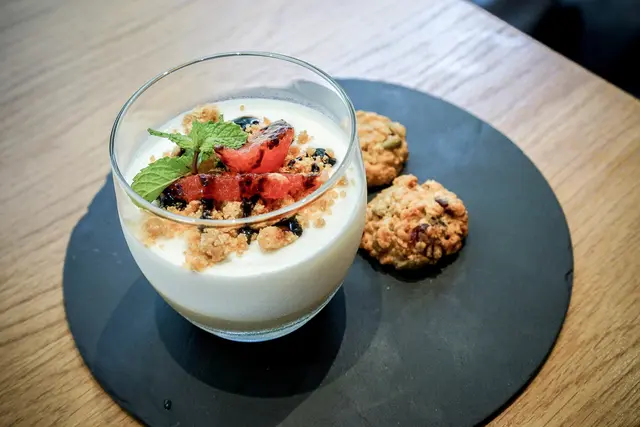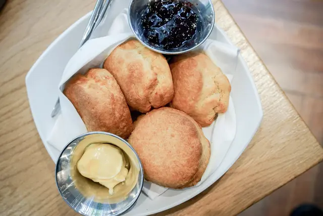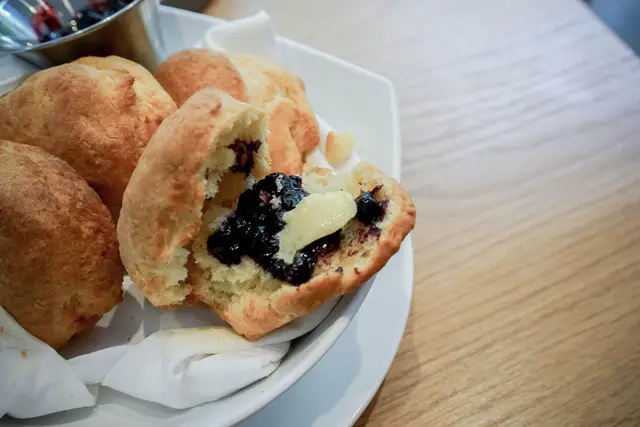 比司吉表皮很脆且有著濃郁奶香,我自己很喜歡,單吃就只有牛奶香,不過比司吉本身就是一顆讓人容易口渴的餐點,建議搭配店家附上的回溫奶油與新鮮的藍莓果醬一起入口,口感頓時變的比較滑,藍莓醬甜度稍高不過配上比司吉有點鹹有點甜的味道,我自己是覺得還不錯,但一顆實在好佔胃部空間,無法在塞下第二顆了。