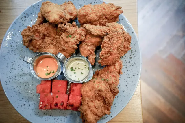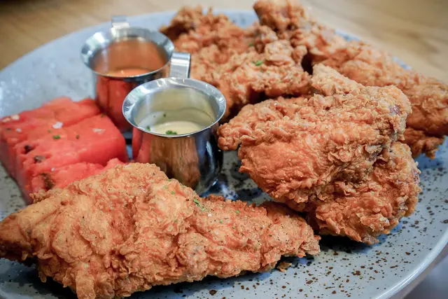 這是buttermilk 必點菜色之一,也是我期待的料理這是美式經典南方風味炸雞,有雞翅,雞腿,雞胸事先用香料海鹽等滷水浸泡後在浸潤於酪奶裡,口感會比較嫩化且軟,一旁的西瓜非常引起我與友人注意。