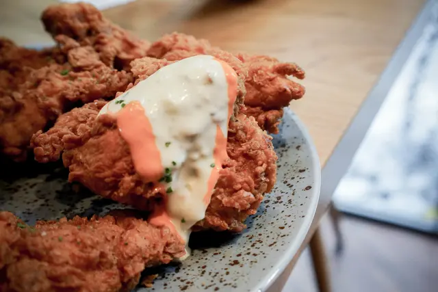 這種酥脆的外皮實在很對我胃口,根本是為我而生的一款炸雞阿,外皮很酥脆且不是那種厚粉的口感,且雞肉因為事先醃漬過,吃起來相當鮮嫩不膩,五塊對我與朋友來說,區區小事很快就解決了。