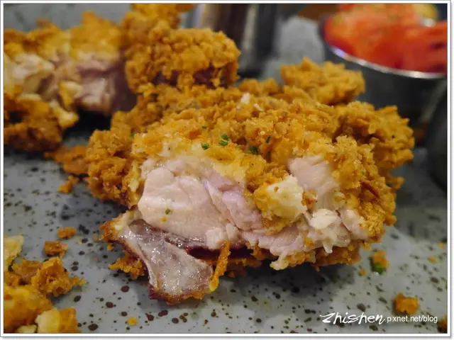 Ω略帶油香的酥脆外皮底下,內裏的雞肉則是相當軟嫩,厲害的是,不是只有雞腿雞翅,而是連一般口感會比較乾柴的雞胸部位也是如此,雖說是沒有肉汁滿溢,不過軟嫩的口感有點不像是在吃雞胸塊來的,而且細嫩的口感中還帶點輕薄乳香(估計醃製有用到乳類相關),單就口感來說,的確有超越一般市面炸雞的FU。