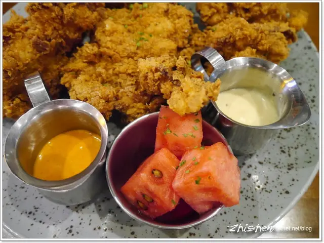 魯個人是大蒜鬼,所以白色的蒜味乳酪醬最合味,而吃起來冰冰涼涼,還帶解油香口氣的酸甜西瓜也頗有感。