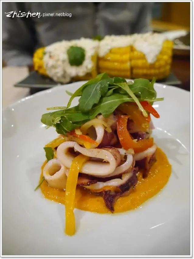 原以為燒烤的小卷會帶點Q彈,沒想到小卷比預期軟嫩不少,少了點個性,不過燒烤,蒜香、巴西里、甜椒、蜂蜜、油醋眾多氣味堆疊,香氣豐富,油醋的酸香與蜂蜜雪莉醬溫和的甜也帶出和諧的酸甜風味,和小卷很搭。