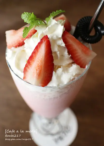 新菜單所推出的草莓起司蛋糕(Strawberry cheese au lait),不是蛋糕甜點而是冰涼的飲料!因店家去日本取材發現日本正流行這類慕斯系飲料!用草莓、牛奶及cream cheese所調製而成的冰涼飲品,粉嫩的色系加上草莓從外觀上就不知道攻略多少喜愛甜食女生的心,濃郁香甜的味道像是思慕昔般的感覺!
