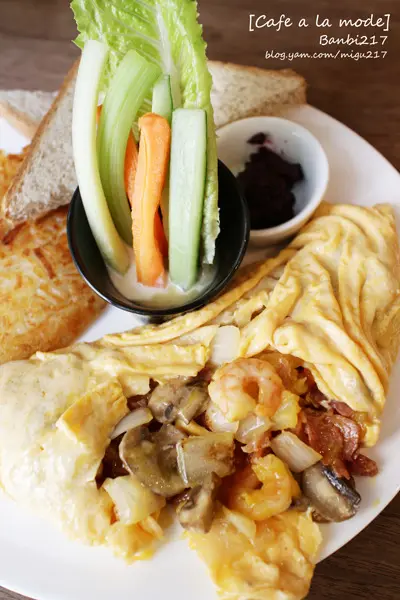 豐盛的早午餐夏威夷鮮蝦歐姆雷特蛋捲有果汁、美式咖啡自製馬鈴薯餅、全麥吐司麵包與手工藍莓蔓越莓果醬、清爽蜂蜜芥末醬與蔬菜棒和Omelette。