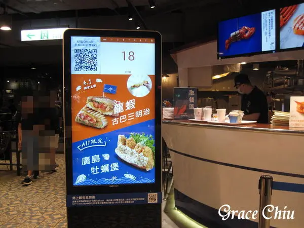 這次的試吃體驗內容為加拿大龍蝦堡(M).薯條或沙拉(我選了沙拉).有氣飲品(可樂或雪碧,我選了雪碧).龍蝦湯,有別於美食街內大部份店家使用的震機提醒取餐,Captain Lobster以大型電子版顯示取餐號,這樣有個缺點就是如果找到的座位太遠或是視線被其他裝潢遮閉較不易及時取餐,將口碑券交付店員後店員並無給我取號單,我以為是因為可以立即取餐所以站在那等,也順便先在周邊拍拍環境,結果等了一會兒我的餐才備好,除了電子立版顯示取餐號外店員在我面前叫號…但我根本不知自己幾號,開口詢問才確定那份餐是我的無誤.