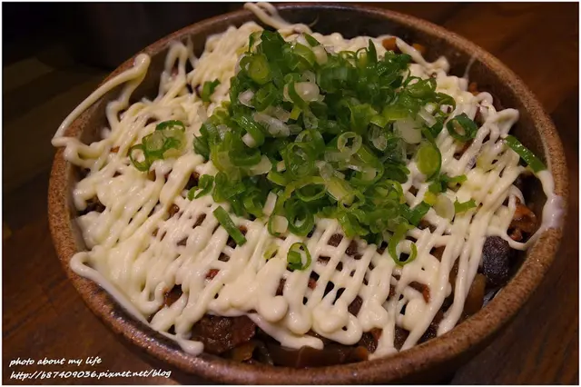 整碗由上而下有蔥花、美乃滋→味噌豬肉和蒟蒻凍→高麗菜絲→白飯 層層疊疊就像蛋糕