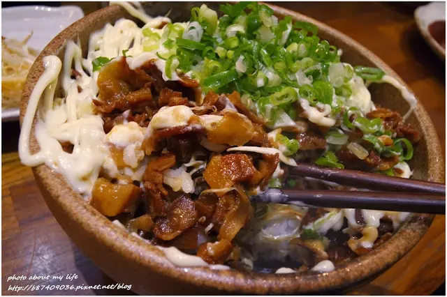 先上桌的味噌豬肉美乃滋高麗菜絲拌飯(190元) 上頭的美乃滋實在太邪惡啦!!!