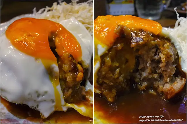 亮澄澄的橘色蛋黃飽滿到會反光 誰捨得戳破啊!有股衝動想把蛋黃一口氣吸進嘴裡 (p.s漢堡肉沒附白飯喔!)