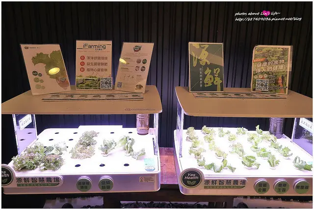 無限量供應的生菜標榜來自無農藥、純淨又產地直送的智慧農場 店門旁還擺了種植生菜的sample