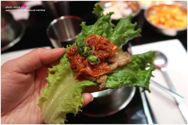 先單吃肉片品嚐原味(好吃!) 沾點辣醬搭泡菜、青蔥、豆芽包在大片生菜裡一起入口更是享受