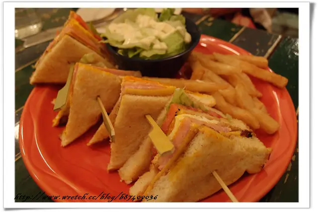 總匯三明治有包心菜沙拉和薯條外還附了杯果汁