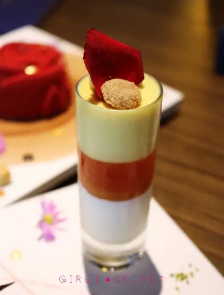 最下層是北海道乳酪慕斯,紅色的是香檳果凍,