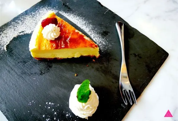 上面綴著小小的草莓和鮮奶油,口感上是比較綿密濕潤的起司蛋糕,不是扎實的口感,
