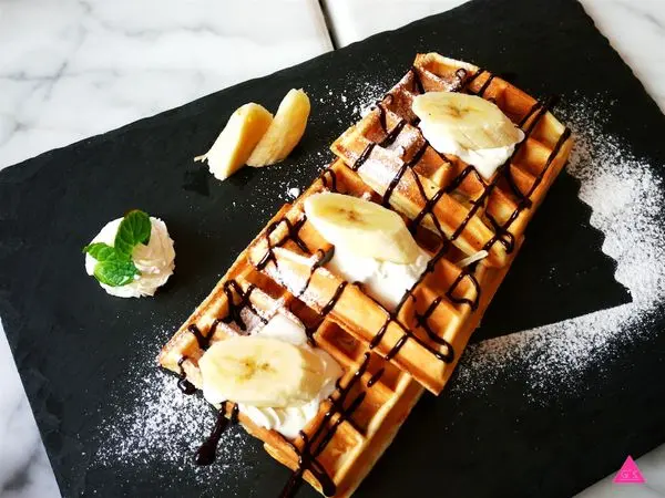 三片方形的鬆餅片搭著鮮奶油、巧克力醬、香蕉切片,鬆餅裡面Q彈的麻糬口感還不賴,