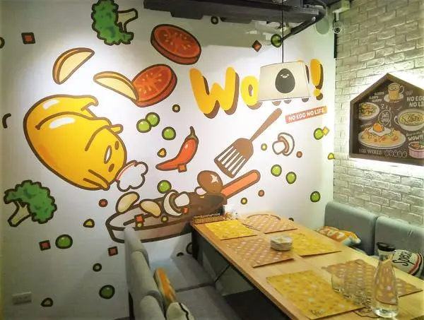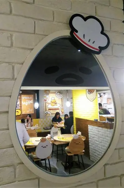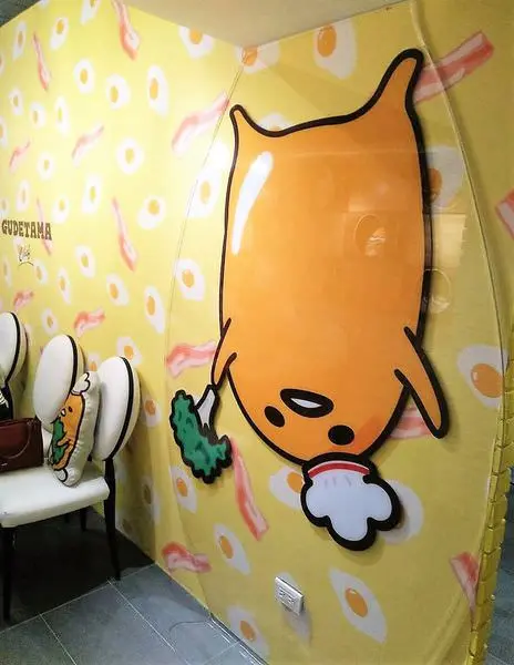 這次的蛋黃哥,又更突破了,連天花板、浴廁、座椅、餐具到餐點都大量融入主題。