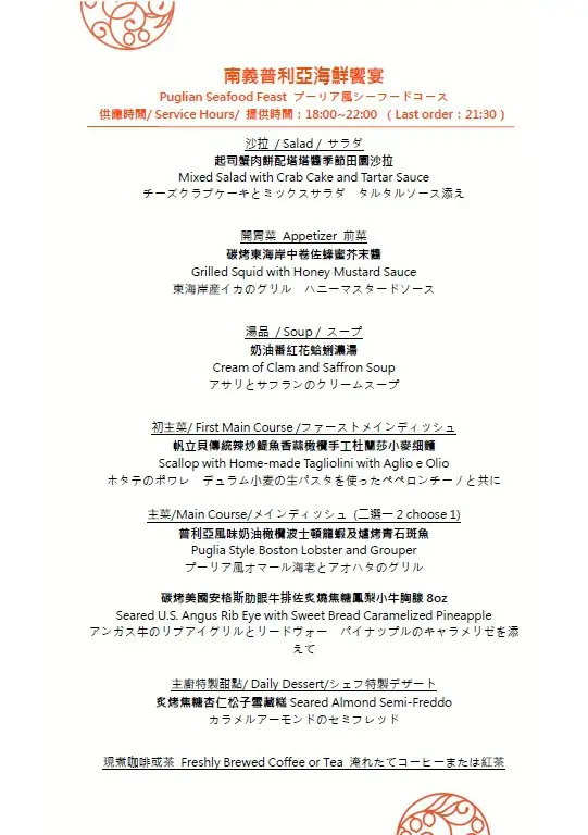 GUSTOSO義大利餐廳:季節限定晚間套餐「南義普利亞海鮮饗宴」,供應至九月底,十月份將推出第四季節限定新品,