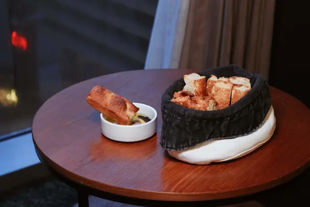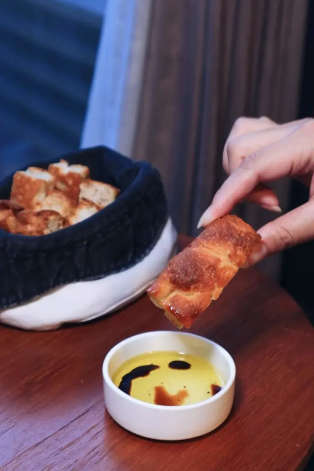 一整籃剛烤好冒著熱氣的麵包,厚實酥脆,沾上橄欖油越嚼越香,