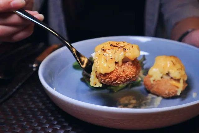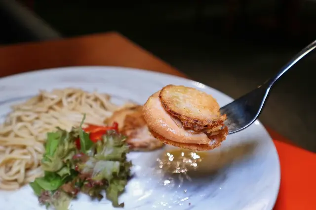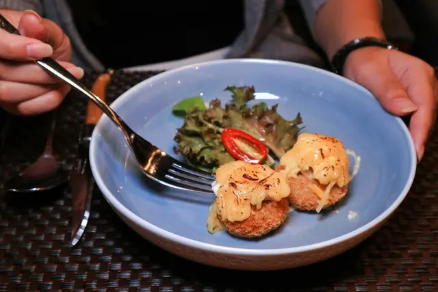 炙烤起司塔塔醬下是炸藍泳蟹肉餅,口感酥脆爽口內裡綿密帶著一絲絲的蟹肉條鮮味,